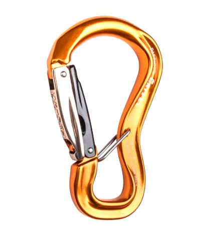 – piatto nella parte inferiore per seguire la forma delle fettucce degli anelli di servizio, con filo di sicurezza “captive” per evitare il “cross loading “ovvero il posizionamento lungo l’asse minore del moschettone, che ridurrebbe molto la sua tenuta