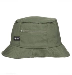 Classico cappello da pescatore, tasca a bustina a sinistra, tasca con cerniera a destra, 2 occhielli di ventilazione con inserto in rete.