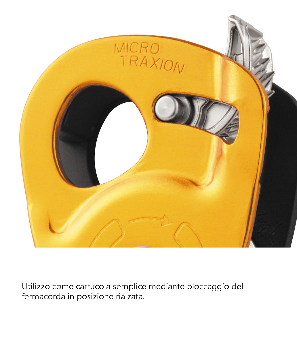 A differenza delle carrucole standard, la Micro Traxion integra un sistema di bloccaggio che lavora in modo sinergico con la puleggia. Il vantaggio principale risiede nel risparmio di energia: ogni centimetro di corda recuperato viene trattenuto senza scorrimenti all’indietro, rendendo le operazioni di sollevamento fluide e sicure.