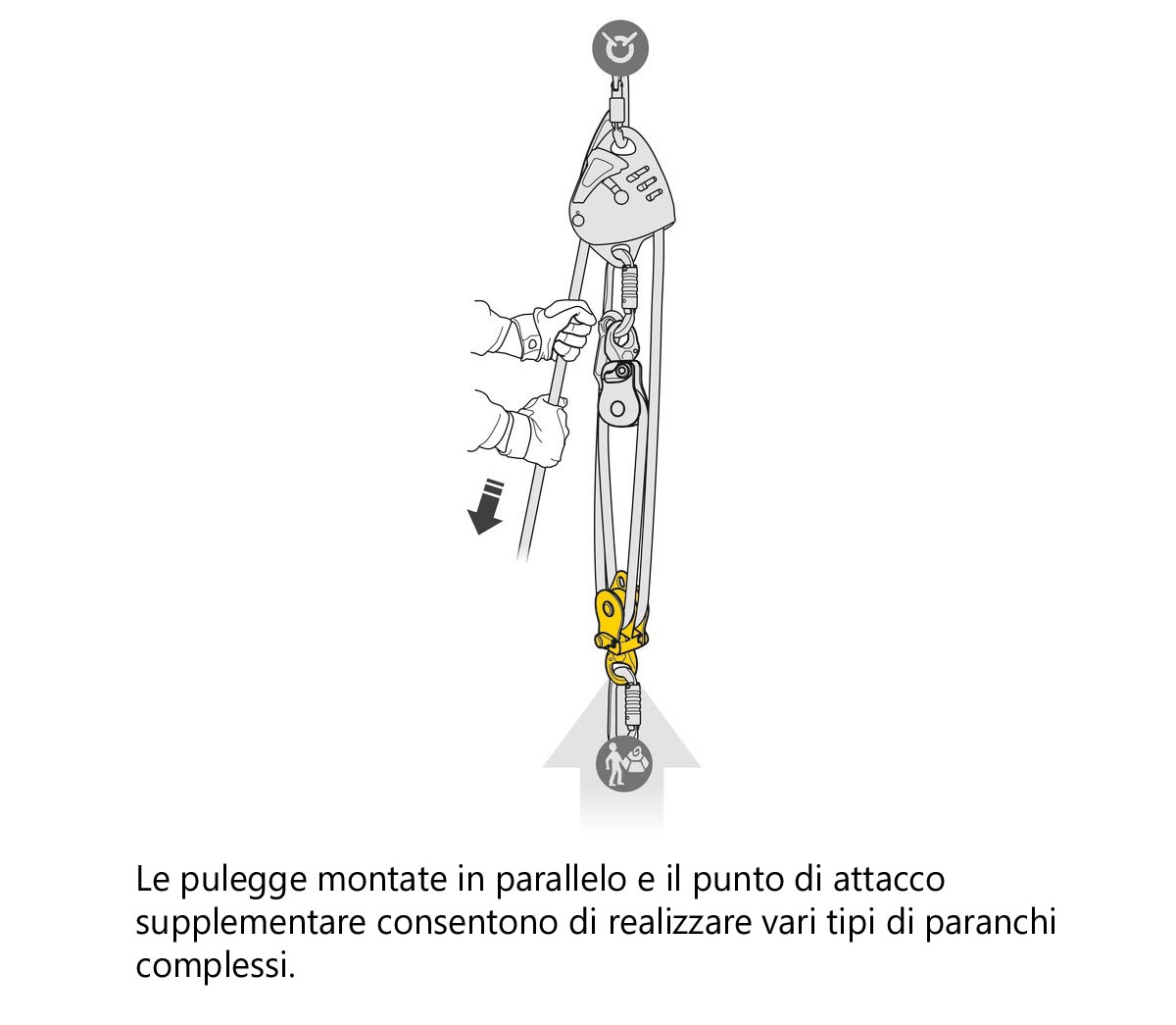 – pulegge montate in parallelo e punto di attacco supplementare per realizzare vari tipi di recupero complessi. - Manovre facilitate: