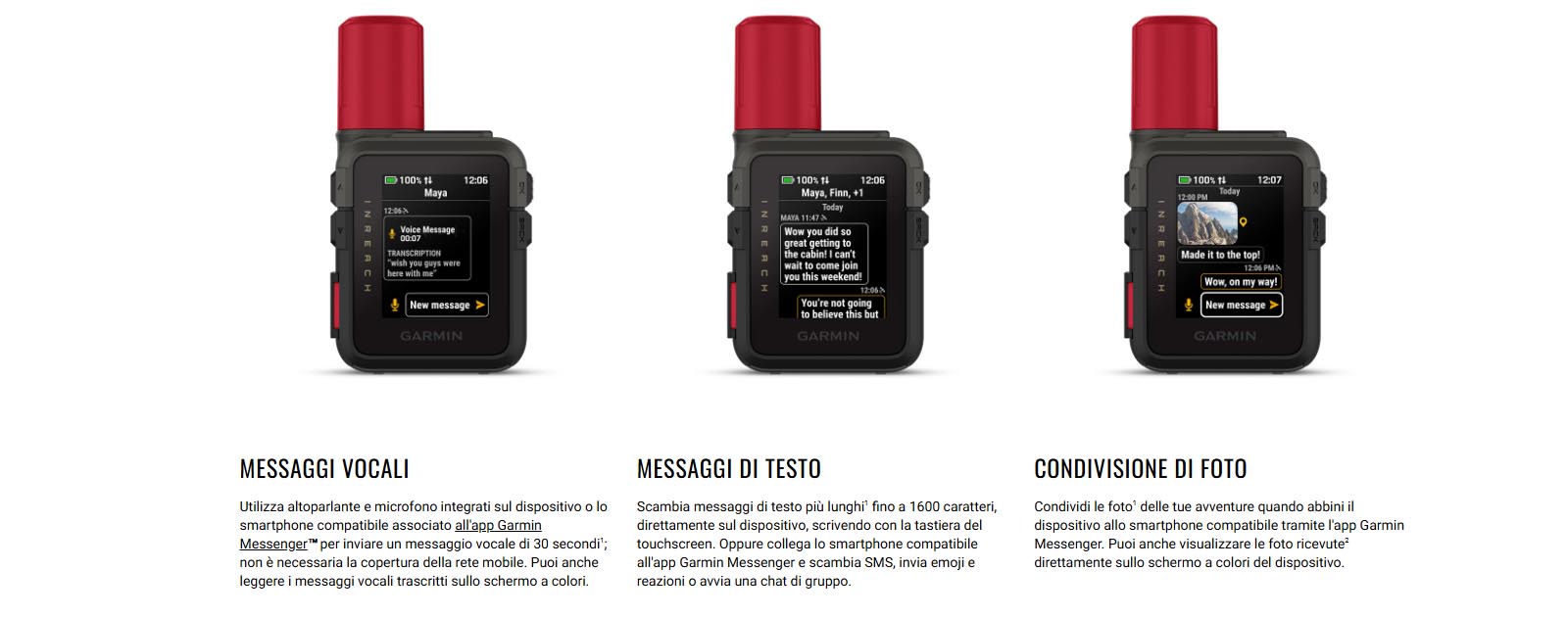 Rimani sempre in contatto con i tuoi cari grazie a inReach Mini 3 Plus, il comunicatore satellitare SOS1 con display touchscreen a colori e altoparlante e microfono integrati. Quando la tua avventura ti porta dove il telefono non può funzionare, la tecnologia in Reach Plus ti consente di inviare SMS, foto e messaggi vocali più lunghi con un abbonamento attivo.