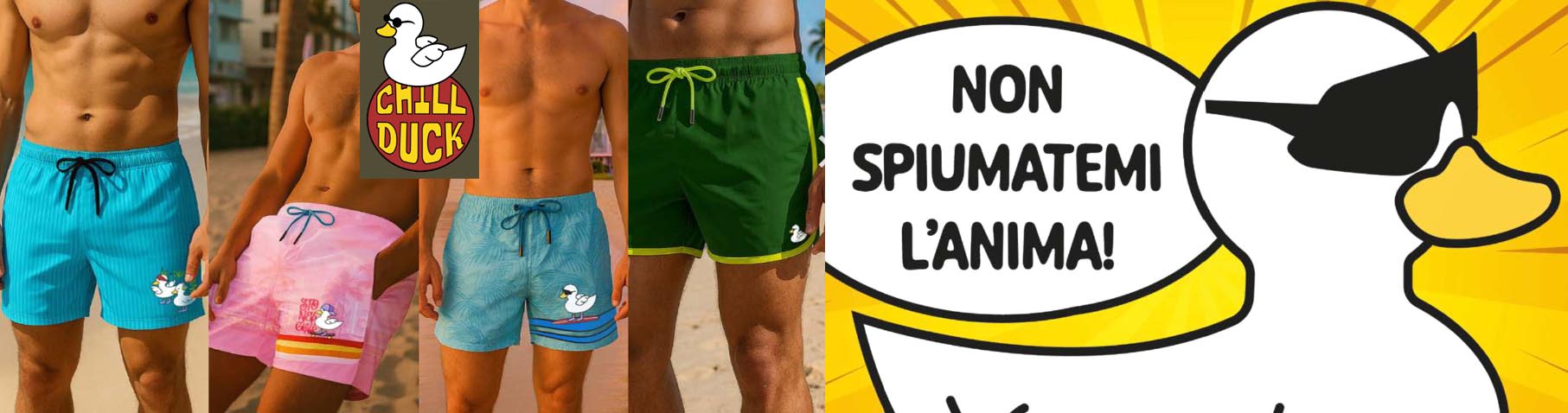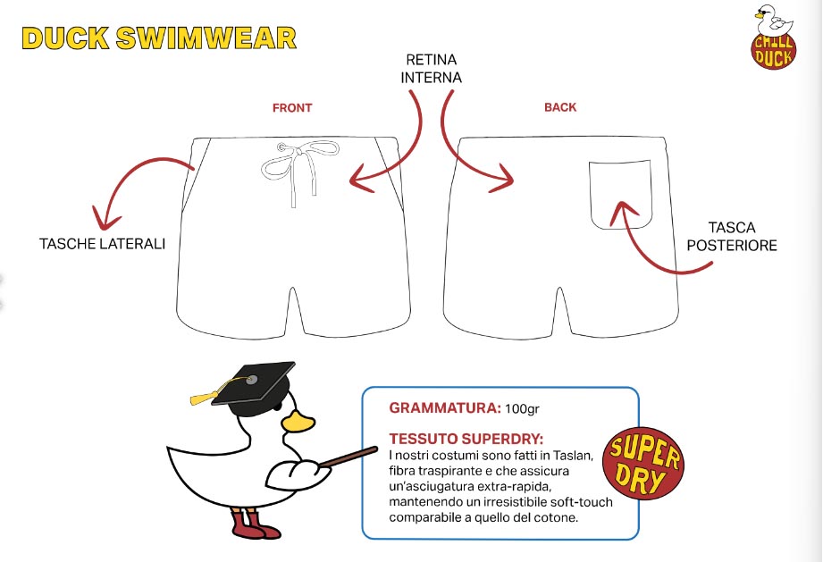 CHILL DUCK offre una gamma di costumi da bagno per uomo, disponibili nelle taglie dalla 46 alla 54 in tantissimi colori. Questi costumi sono progettati per garantire comfort e stile, utilizzando la fibra traspirante TASLAN che assicura un’asciugatura extra-rapida, mantenendo un irresistibile soft-touch comparabile a quella del cotone.