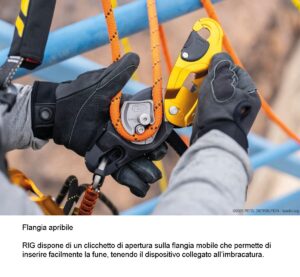 – superamento del frazionamento facilitato, grazie alla flangia mobile apribile che consente di tenere il dispositivo collegato all’imbracatura,