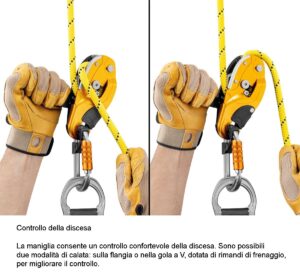 – due modalità di calata possibili: sulla flangia o nella gola a V, dotata di rimandi di frenaggio per un miglior controllo della calata e ridurre l’attorcigliamento della fune,