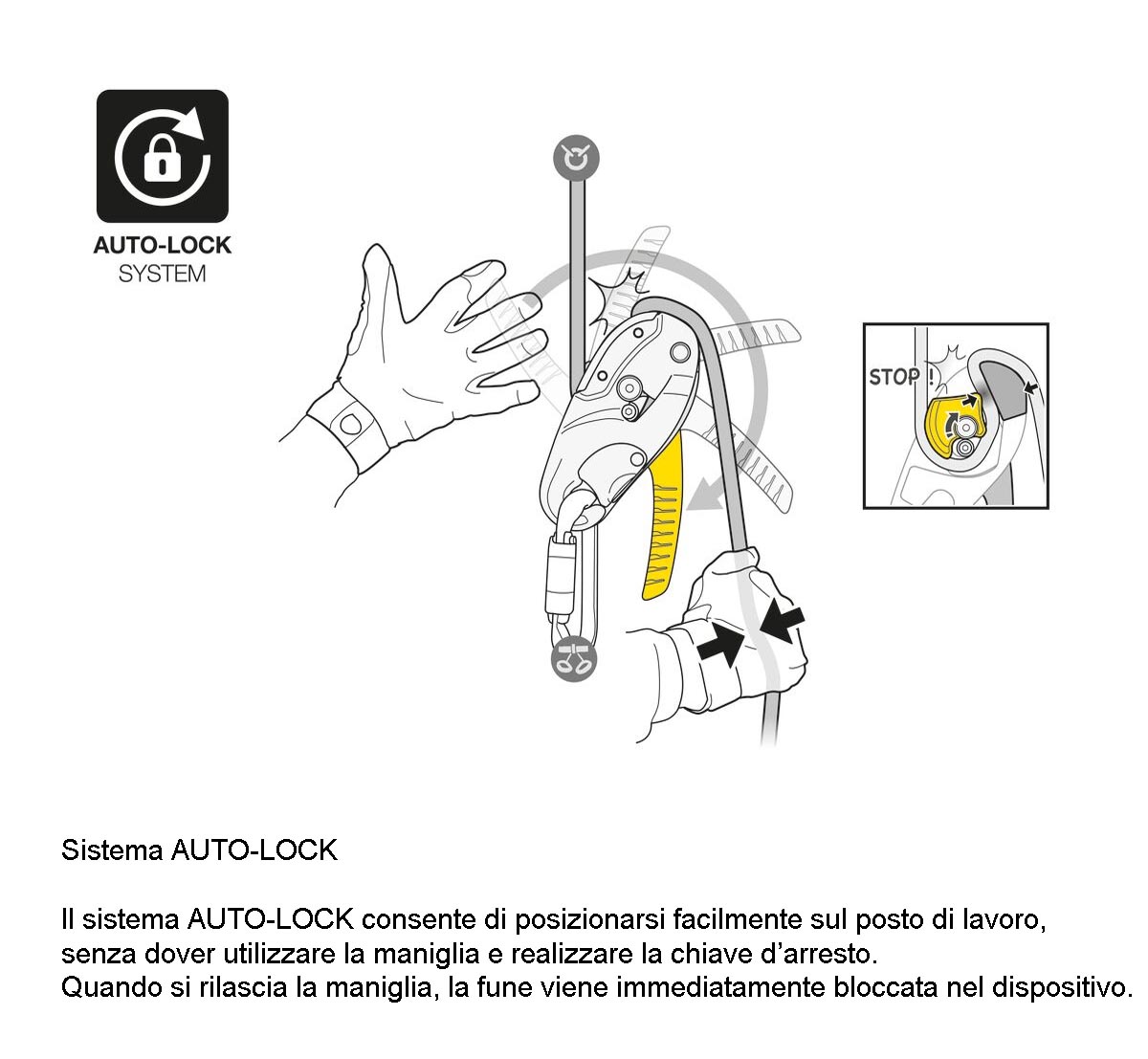 – un volta bloccata la fune, è possibile effettuare brevi risalite, senza utilizzo della maniglia, semplicemente recuperando la fune,