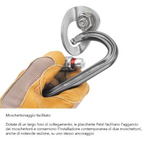 – la larghezza del foro consente d’installare due moschettoni contemporaneamente.