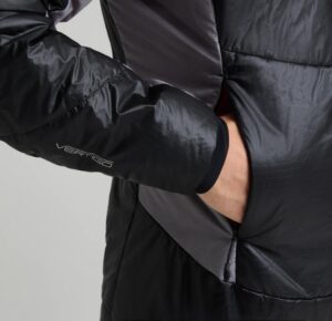 PrimaLoft® Gold Hi-Loft Ultra (90g/mq) utilizza fibre siliconate per garantire un’eccezionale resistenza all’acqua. La sua tecnologia Cross Core™ è basata su aerogel. Le fibre Primaloft sono fuse con l’Aerogel per creare comfort e prestazioni di livello superiore. Originariamente sviluppato dalla NASA per applicazioni aerospaziali, l’aerogel è il materiale solido più leggero sulla terra, composto per oltre il 95% da aria. Fornisce livelli di leggerezza e calore precedentemente raggiunti solo da un piumino, mentre un’esclusiva costruzione a fisarmonica offre un loft resiliente e un rapido recupero della compressione. Utilizzando fibre plissettate verticalmente, intrappola più aria a parità di peso e offre un migliore recupero della forma. E’ composto da poliestere riciclato al 74%.