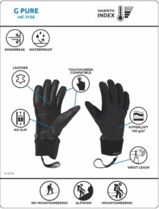 Essenzialità che si vede a colpo d’occhio e che si sente quando lo si indossa: il G Pure è un guanto diverso, puro in ogni dettaglio. Cominciamo dall’aspetto: colore nero, uniforme, e sobrietà nelle marcature. E poi l’assenza di cuciture sul dorso, che contribuisce all’estetica ma anche alla vestibilità. Così come il polso: elastico e privo di strap per adattarsi perfettamente all’utilizzatore. Il G Pure è quindi molto aderente, studiato per diventare un tutt’uno con la mano. Tutto questo senza trascurare l’impermeabilità, assicurata dalla membrana DRYZONE®, e un’ottima resa termica, garantita dall’imbottitura in Hyperloft 100 g/m2 sul dorso. Il palmo in pelle di pecora con rinforzi in pelle di capra nei punti di maggiore usura è sinonimo di resistenza e durata, facendo del G Pure un prodotto estremamente versatile, ideale per tutte le attività in montagna: un guanto “completo”, a 360 gradi, che realizza la nostra filosofia della leggerezza e dell’essenzialità per assicurare alle vostre mani un comfort senza precedenti.