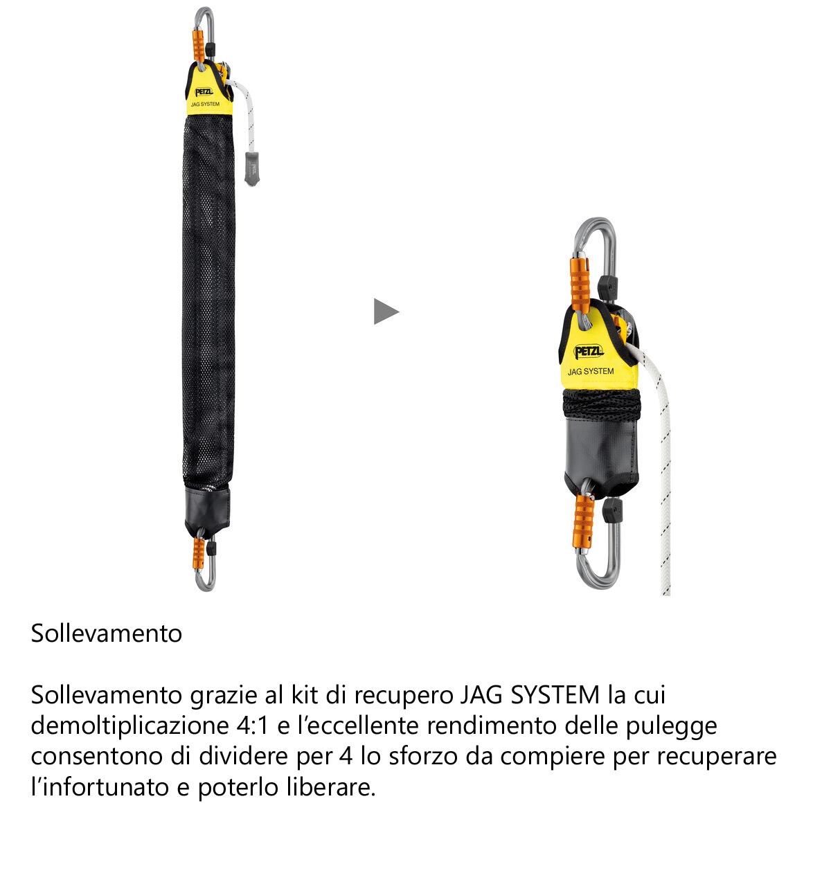 – sgancio grazie al kit di recupero JAG SYSTEM la cui demoltiplicazione 4:1 e l’eccellente rendimento delle pulegge consentono di dividere per 4 lo sforzo da compiere per recuperare l’infortunato e poterlo liberare,