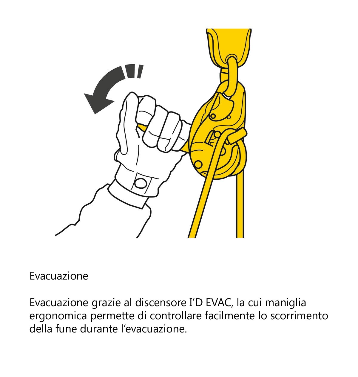 – evacuazione grazie al discensore I’D EVAC, la cui maniglia è appositamente progettata per calare facilmente un infortunato. Una funzione antipanico si avvia se l’utilizzatore tira troppo forte la maniglia che frena e poi arresta automaticamente la discesa. - Sempre pronto per l’uso per intervenire rapidamente: