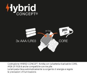 – fornita con la batteria ricaricabile CORE, ARIA 2R RGB è anche compatibile con tre pile AAA/LR03 (non fornite), grazie alla costruzione HYBRID CONCEPT,