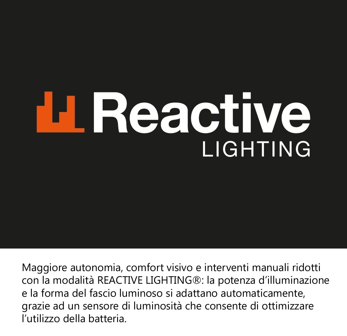 – maggiore autonomia, comfort visivo e interventi manuali ridotti con la modalità REACTIVE LIGHTING®. La potenza d’illuminazione e la forma del fascio luminoso si adattano automaticamente, grazie ad un sensore di luminosità che consente di ottimizzare l’utilizzo della batteria,