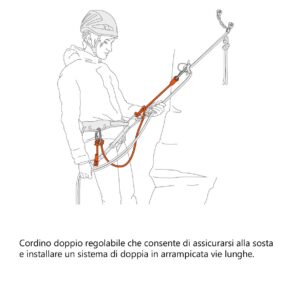 - Cordino doppio di posizionamento regolabile che consente di assicurarsi alla sosta e installare un sistema di doppia in arrampicata vie lunghe: