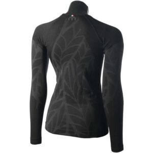 Seamless realizzato con fibra di polipropilene Dryarn® ad alto grado di trasferimento dell’umidità corporea (verso l’interno) in combinazione con pura lana Merinos, il migliore coibente termico presente in natura – Morbido, confortevole ed ipoallerganico aderisce senza costrizioni per creare un’efficace barriera contro il freddo – zone di traspirazione sotto le braccia e nella parte alta della schiena – struttura compatta sul busto – leggera compressione nella parte finale delle maniche