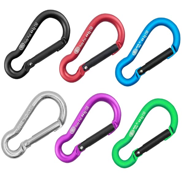 Piccolo moschettone in alluminio, da utilizzare come supporto accessori o portachiavi.