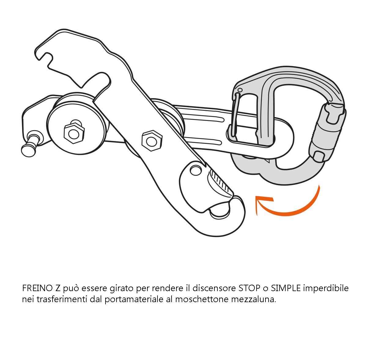 – sistema di bloccaggio automatico TWIST-LOCK per un’apertura rapida. - Può essere girato per rendere il discensore STOP o SIMPLE imperdibile nei trasferimenti dal portamateriale al moschettone mezzaluna,
