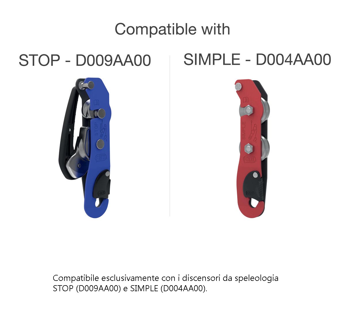 - Compatibile esclusivamente con i discensori da speleologia STOP (D009AA00) e SIMPLE (D004AA00).