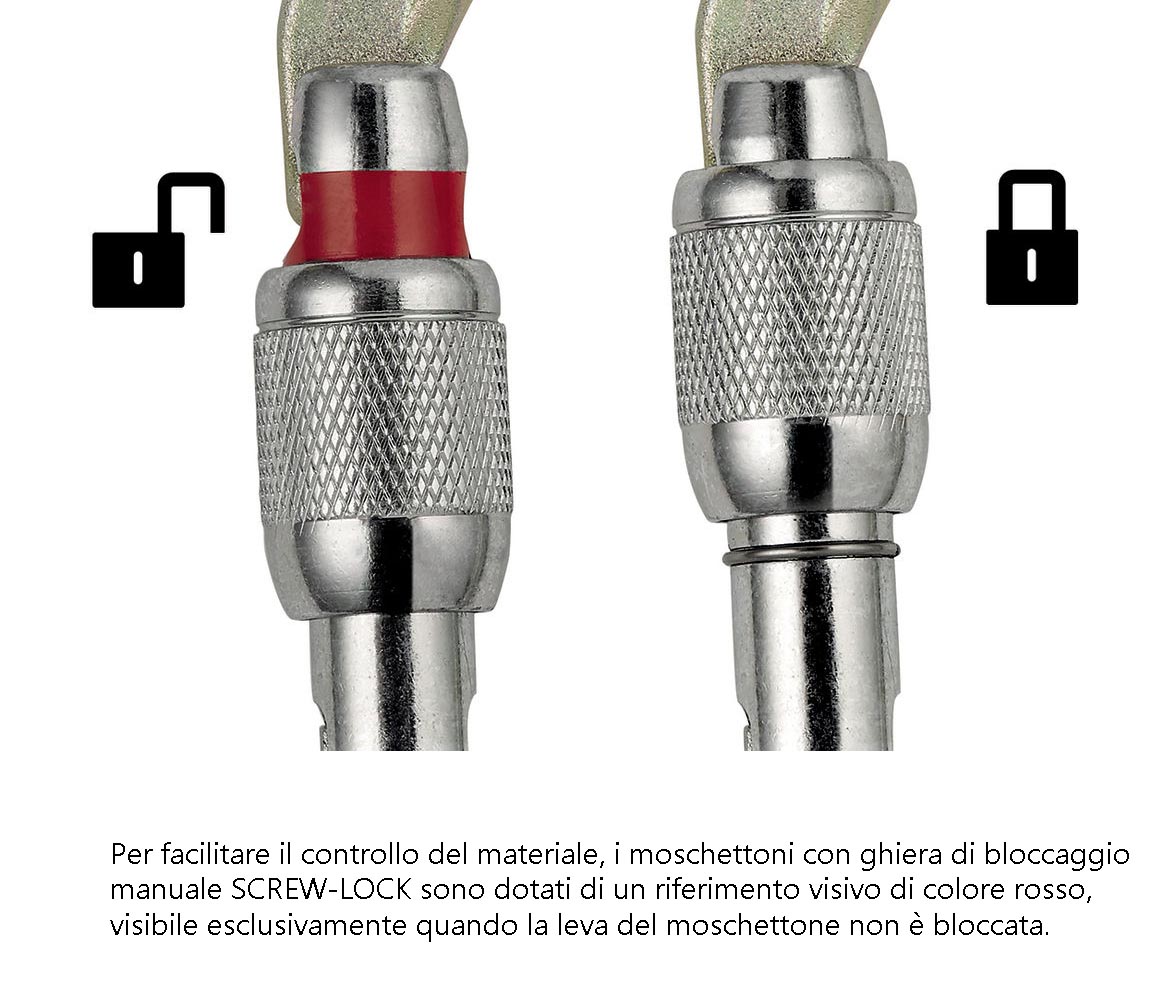 – SCREW-LOCK: bloccaggio manuale a vite con indicatore visivo rosso quando il moschettone non è bloccato. - Disponibile in versione europea e internazionale.