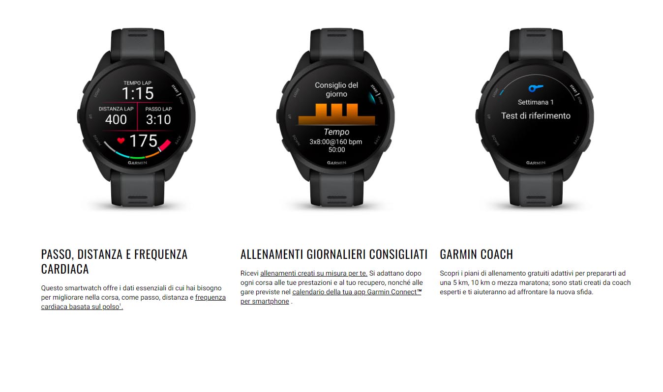 Forerunner® 165 è il GPS smartwatch appositamente progettato per la corsa, che ti aiuta a raggiungere i tuoi obiettivi con piani di allenamento adattativi personalizzati e un display AMOLED per avere in un colpo d’occhio i tuoi progressi.
