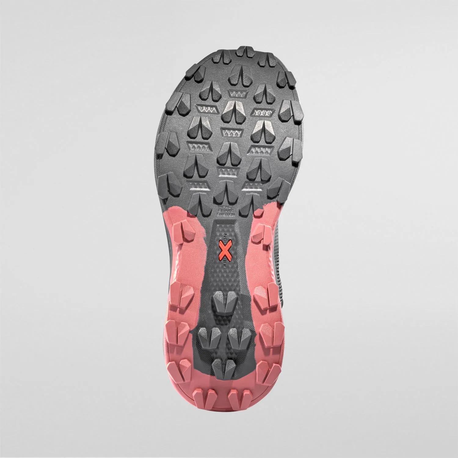 Concepito e sviluppato dal centro di Ricerca e Sviluppo La Sportiva, offre vantaggi reali durante la corsa riducendo l’impatto negativo con il terreno. La particolare disposizione dei tasselli fa in modo che alcuni di essi vengano a contatto per primi con il terreno addolcendo l’appoggio del battistrada.