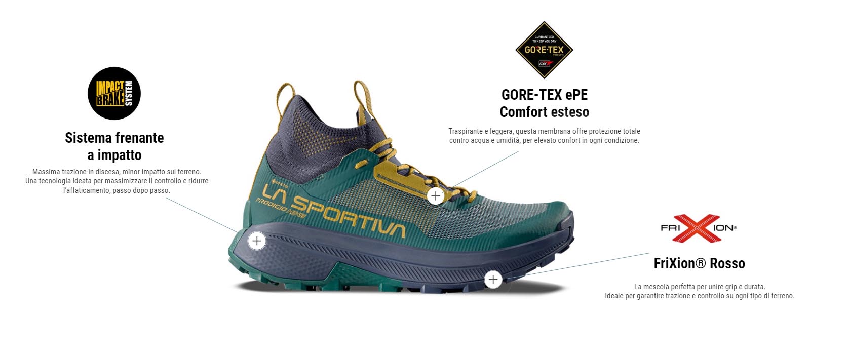 Il rivoluzionario Prodigio Hike GTX è per gli escursionisti veloci che vogliono muoversi in modo efficiente su terreni montani. Realizzata con la nostra tomaia in High Tenacity Mesh, aspettati un’ammortizzazione e una traspirabilità eccezionali mentre ti muovi rapidamente su traversate e salite impegnative. In caso di pioggia, la membrana GORE-TEX ePE Extended Comfort mantiene i piedi asciutti in tutte le condizioni in modo da poterti concentrare sul sentiero. La forma ergonomica del tallone e la protezione in gomma della coda offrono una tenuta e un supporto eccezionali, mentre l’innovativo collare in maglia avvolge per una maggiore stabilità della caviglia man mano che aumenti il ritmo.