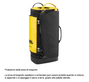 – la zona di trasporto (spallacci e schienale) può essere protetta quando si solleva, si appende o si appoggia il sacco a terra, grazie alla patella laterale in tessuto rinforzato. - Organizzazione del materiale: