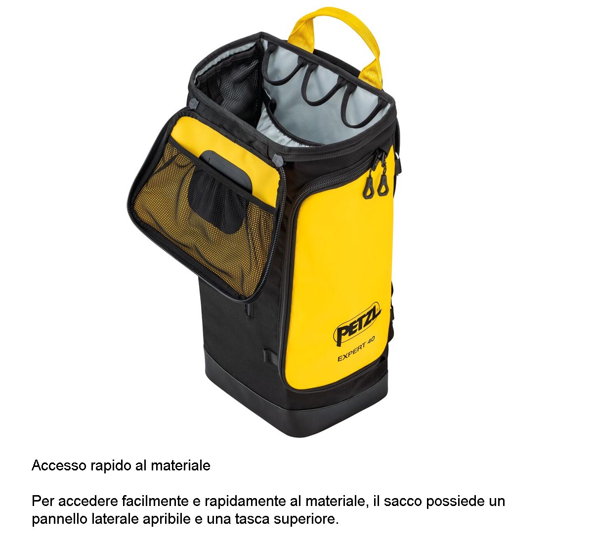 EXPERT 40 è un sacco personale progettato per organizzare e trasportare il materiale. Comodo da portare, grazie all’imbottitura sulle zone di contatto. Le tasche di diversi formati e i portamateriali vi consentono di organizzare e assicurare l’attrezzatura. Le due opzioni di apertura vi consentono di accedere rapidamente e facilmente a tutto quello di cui avete bisogno. La costruzione robusta, con tessuto tech TPU, fondo saldato e tessuto rinforzato, ne fa un sacco progettato per gli utilizzi intensivi.
